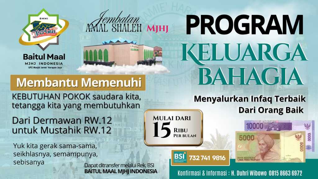 Alhamdulillah atas izin Allah Subhanahu Wa ta’ala  dan ucapkan terimakasih atas partisipasi semua pihak diantaranya Pengurus Lingkungan di wilayah RW12, Yayasan MJHJ, DKM MJHJ, Para Donatur, Relawan dan semua pihak yang tidak dapat di sebutkan satu persatu, sehingga Baitul Maal MJHJ Indonesia dapat melaksanakan distribusi ke 3 pada program keluarga bahagia pada 1 Januari 2026 sebagai distribusi periode Desember 2025.