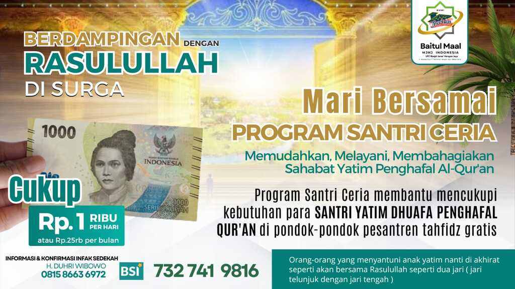 Program ini untuk penyaluran bantuan kepada pondok pesantren Tahfiz Qur'an yang santri nya tidak pungut biaya, Dengan berpartisipasi pada program ini di harapkan kita mendapatkan amal jariah dari ilmu yang di amalkan para santri dalam mempelajari dan mengajarkan Al Qur'an.